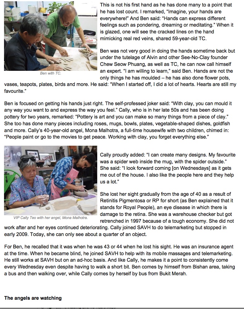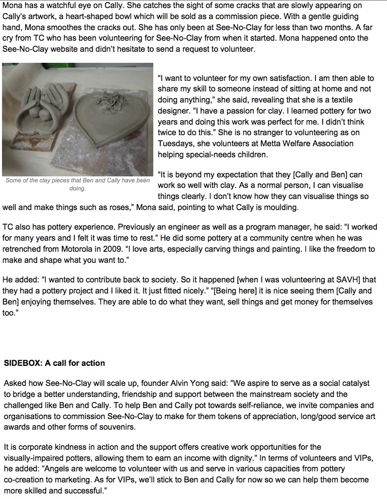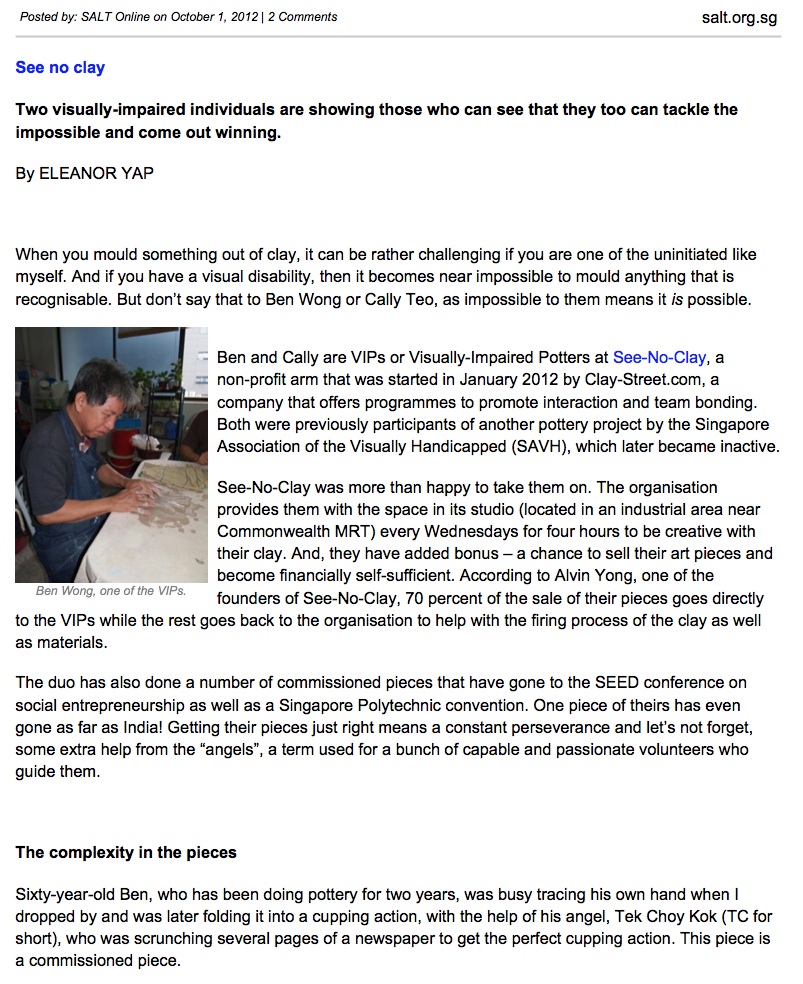 “See no clay” – two visually-impaired individuals are showing those who can see that they too can tackle the impossible and come out winning. Published on SALT Online (by the National Volunteer & Philanthropy Centre), Oct 2012.