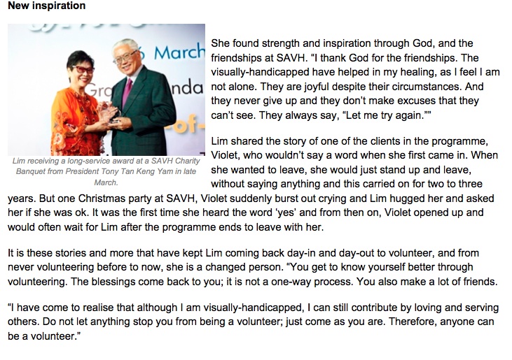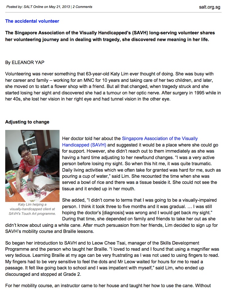“The accidental volunteer” – the Singapore Association of the Visually Handicapped’s (SAVH) long-serving volunteer shares her volunteering journey and in dealing with tragedy, she discovered new meaning in her life. Published on SALT Online, May 2013.