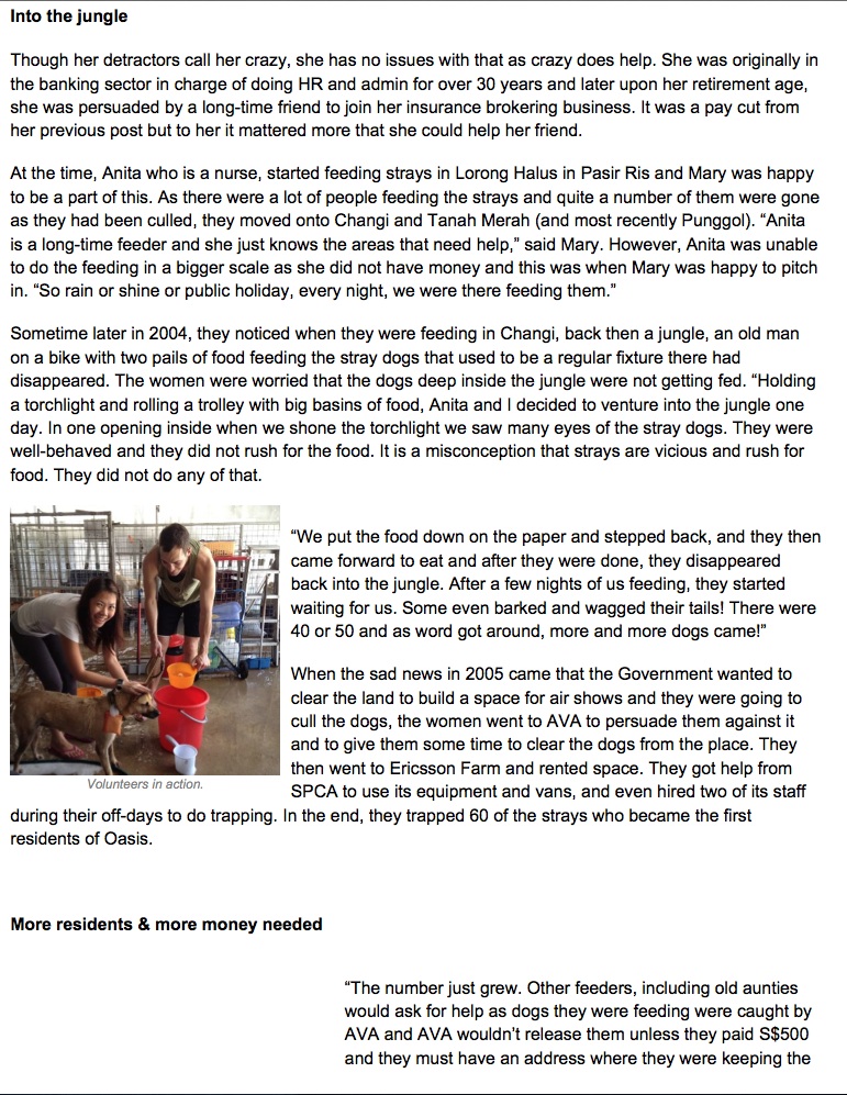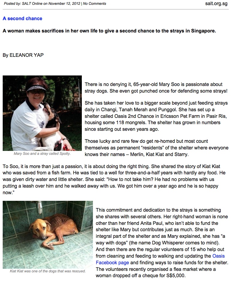 “A second chance” – a woman makes sacrifices in her own life to give a second chance to the strays in Singapore. Published on SALT Online, Nov 2012.
